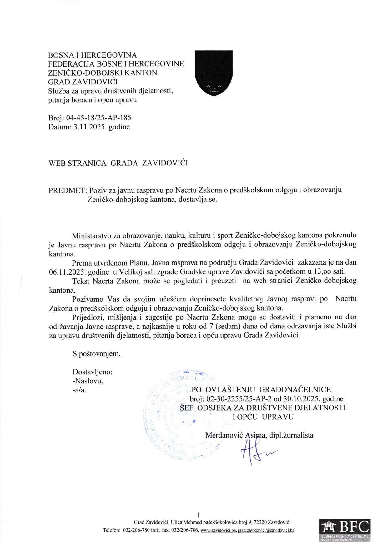 E- mail: grad.zavidovici@zavidovici.ba