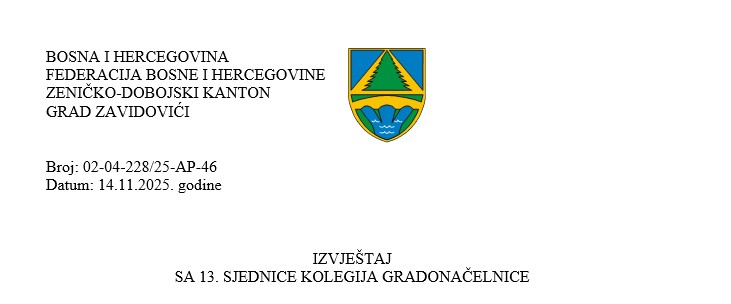 - sjednica Kolegija gradonačelnice održana je 14.11.2025. godine sa početkom u 07:35 sati, u Kabinetu gradonačelnice, treći sprat zgrade organa uprave Grada Zavidovići.