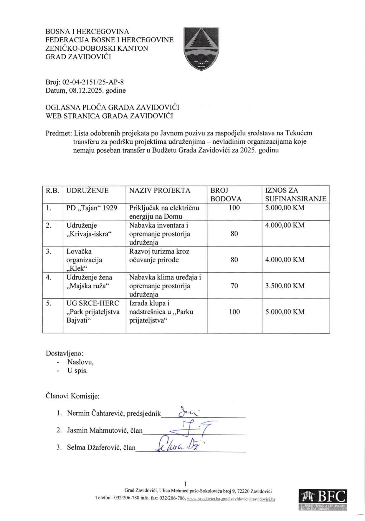 • Lista odobrenih projekata po Javnom poziv za raspodjelu sredstava na Tekućem transferu za podrušku projektima udruženjima – nevladinim organizacijama koje nemaju poseban transfer u Budžetu Grada Zavidovići za 2025. godinu 9. Decembra 2025.